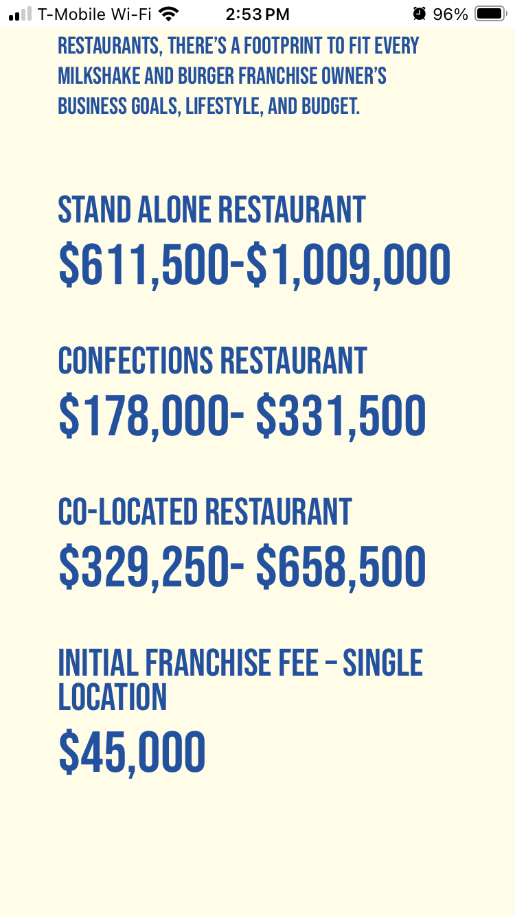 The article details that a Fosters Freeze location in a rural California town will be shutting down because the state minimum wage for fast food workers increased to $20 on April 1, 2024. The manager of the local franchise in Lemoore, California waited until April fools day to text all the workers the location would be shutting down because he “didn’t want to ruin their Easter Sunday” which implies that the layoffs were well known ahead of April 1st. The story got me wondering how much it costs to start a Fosters Freeze location and I found this on their corporate franchise website: