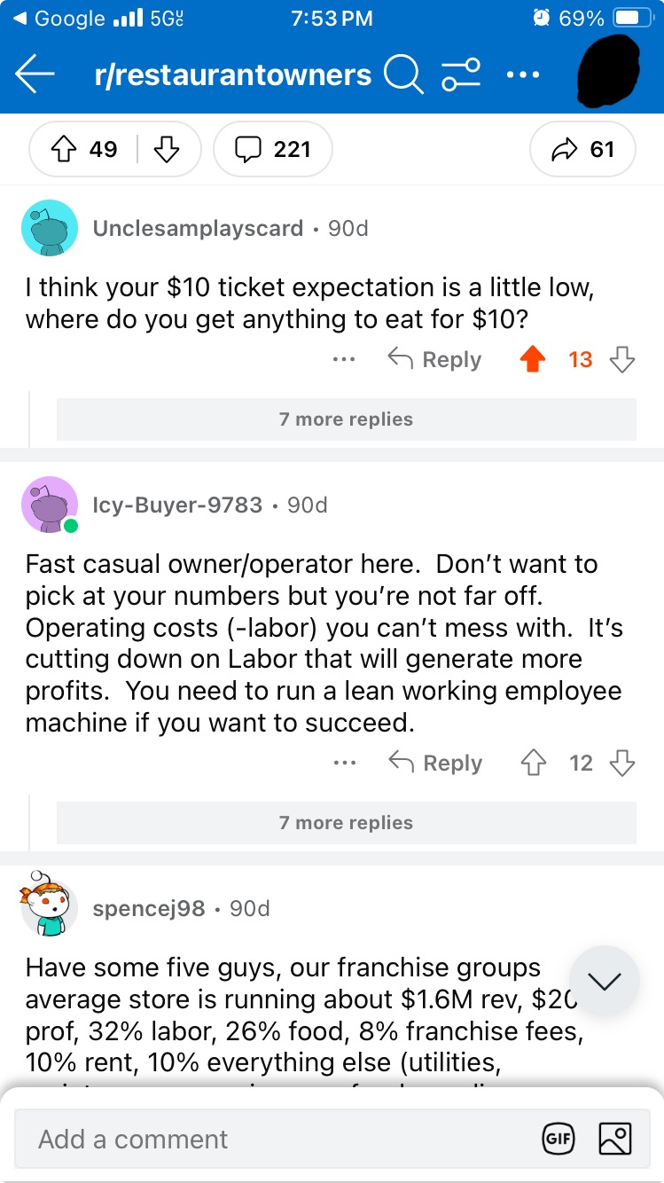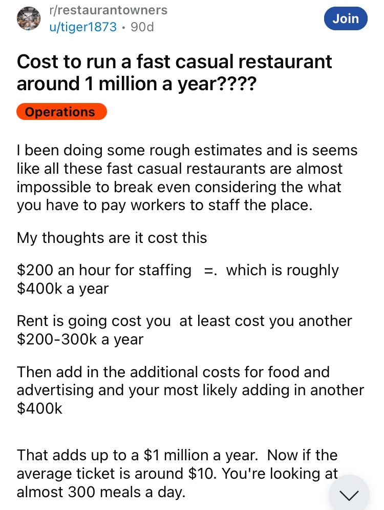 Franchise fees alone are $45,000 – which i suppose decreases if an individual proprietor decides to open multiple – all for basically branding and legal support. The work is still carried out by the individual proprietor or whomever gets hired to do so. And that’s just the “initial” franchise fee. I imagine it gets higher over time as corporate investors seek higher returns “due to inflation”. All of this means that less money stays in local economies and the pockets of individual proprietors/investors. A quick search for how much it costs to start a fast food restauraunt in Orange County California offers that $1million is the starting point according to some reddit restaurant owners: